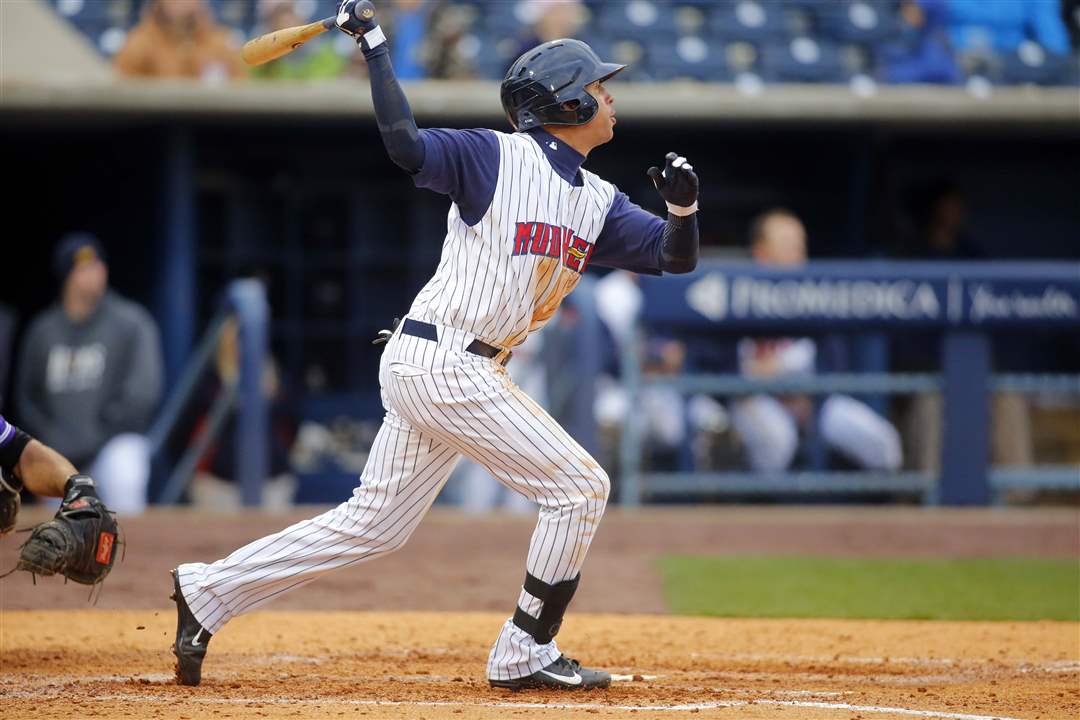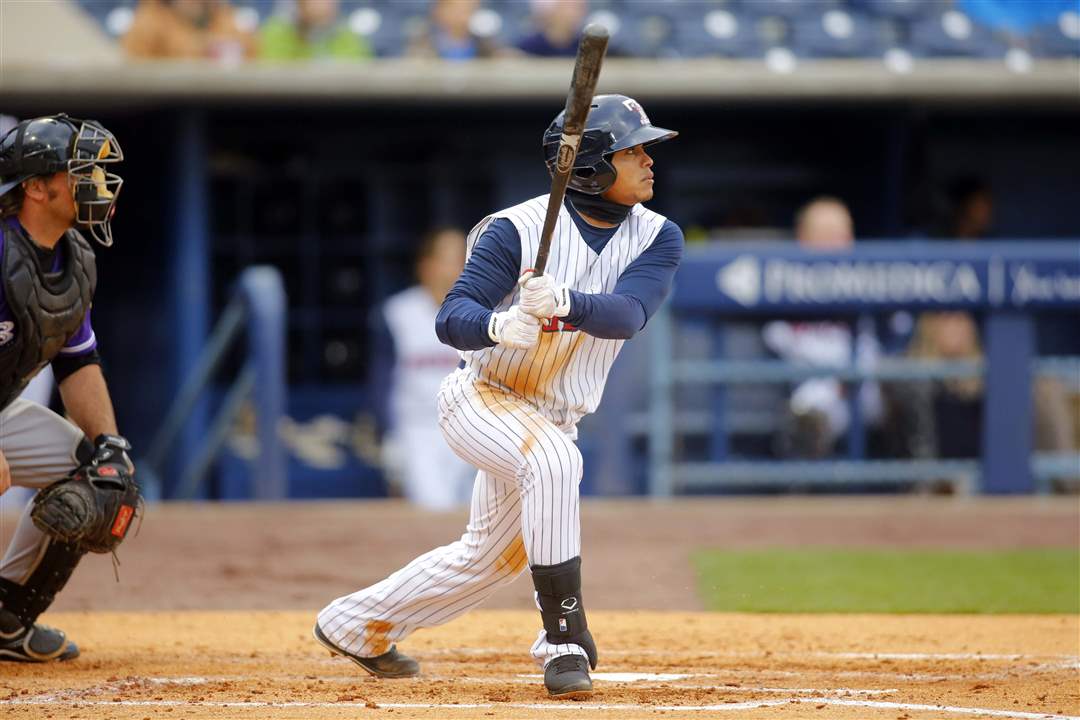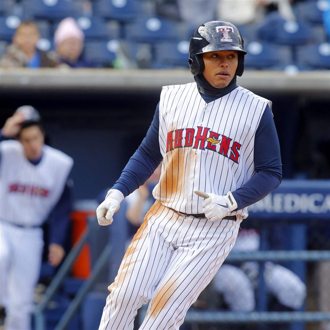 Toledo Mud Hens player Nick Castellanos singles in the first inning.