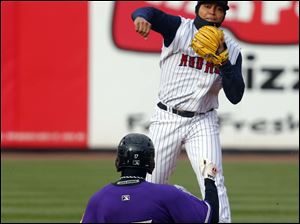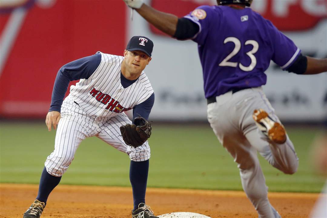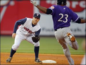 Toledo Mud Hens player Danny Worth waits to make an easy tag on the steal attempt of Denis Phipps (23).