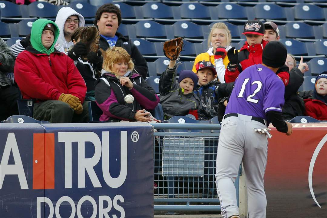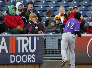 Louisville Bats third baseman Henry Rodriguez (12) can't grab a Toledo Mud Hens foul ball as it almost hits a fan during the first inning.