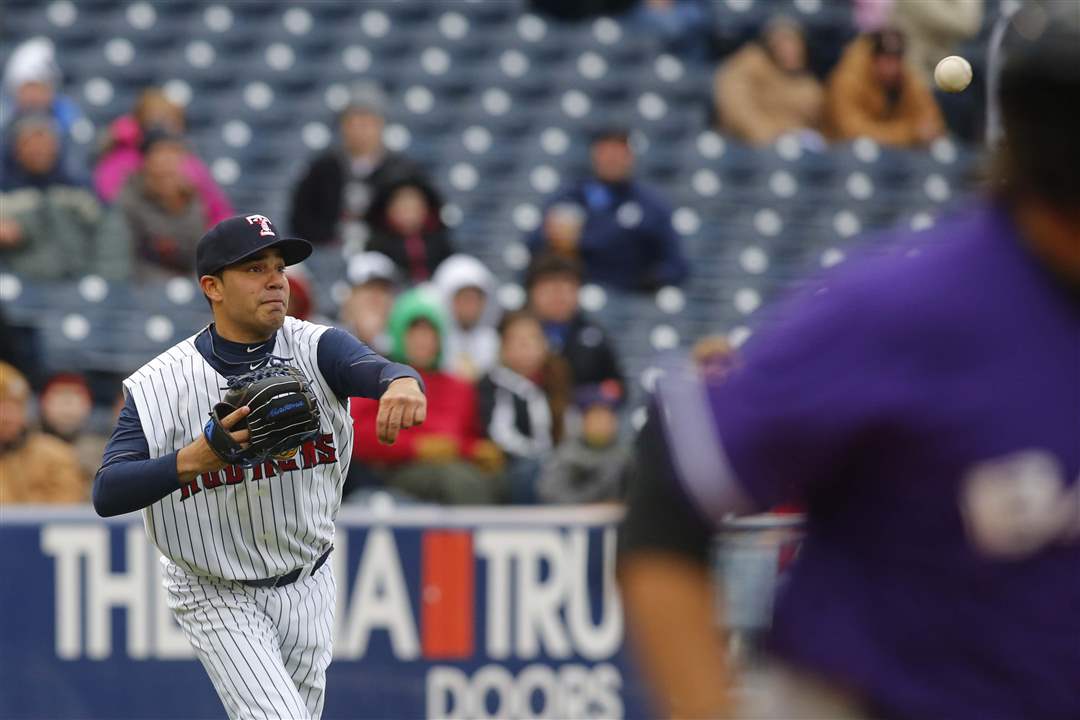Toledo Mud Hens player Gustavo Nunez scores on a single by Nick Castellanos in the first inning.