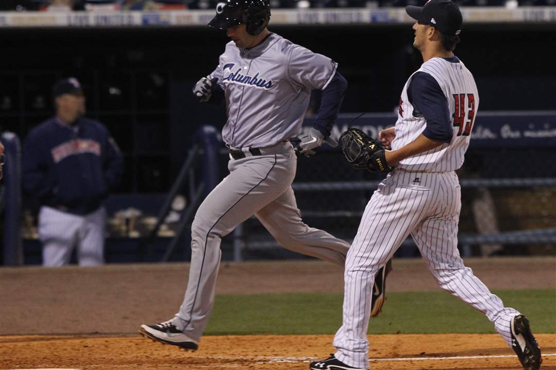 Columbus' Matt Pagnozzi scores on a bad pitch from Hen pitcher Brayan Villarreal (43) at Fifth Third Field.