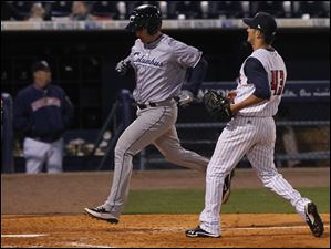 Mud Hen Justin Henry scores while Columbus catcher Matt Pagnozzi waits for the throw to the plate. Henry scored on a sacrifice fly in the 3rd inning.