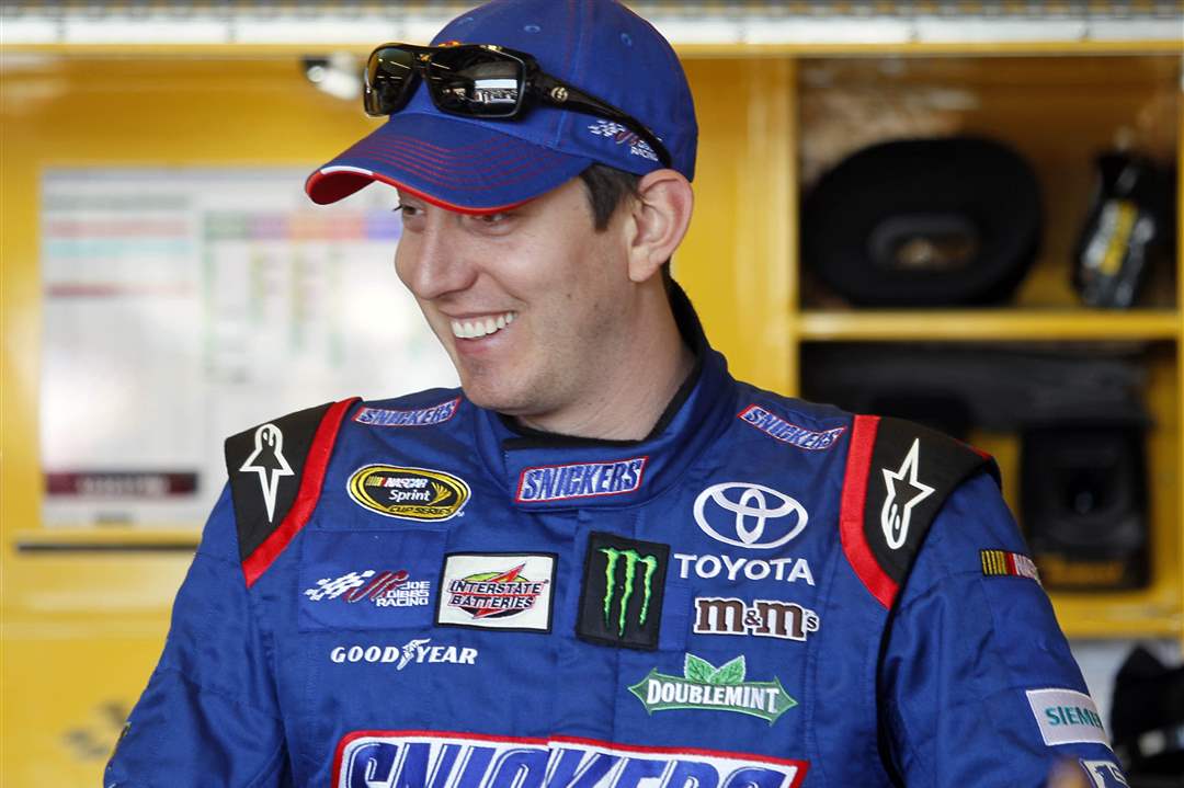 Kyle Busch has a laugh in his garage before the Sprint Cup Practice at Michigan International Speedway.