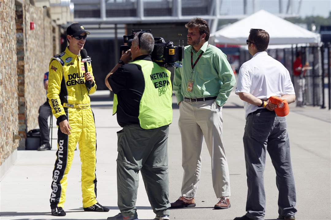 NASCAR driver Joey Logano, left, films a spot for ESPN at Michigan International Speedway.