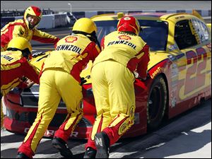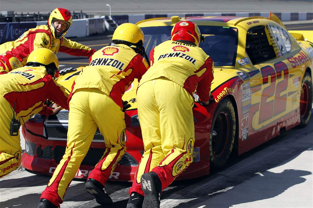 The crew for Kurt Busch pushes back his car after a pit stop during the Pure Michigan 400.