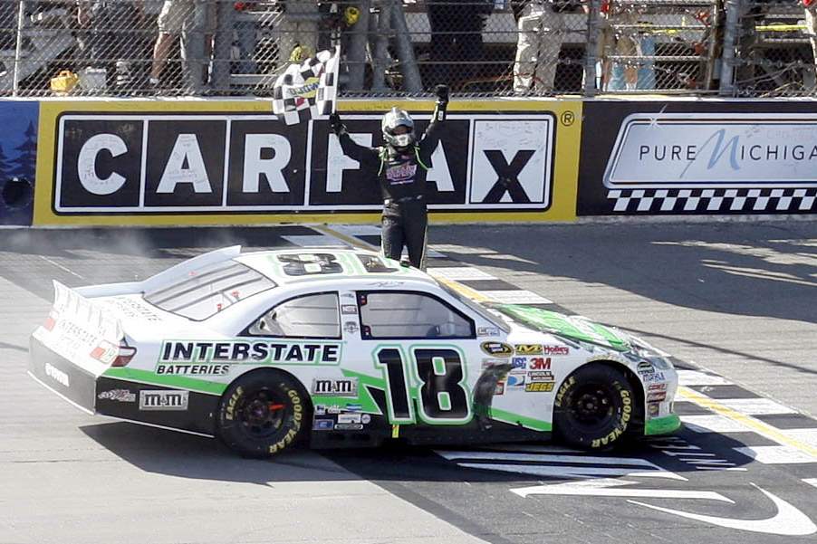 Kyle Busch gets out of his car after a burn out to celebrate his Pure Michigan 400 win.