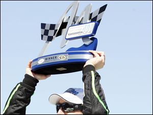Kyle Busch lifts his trophy after winning the Pure Michigan 400.
