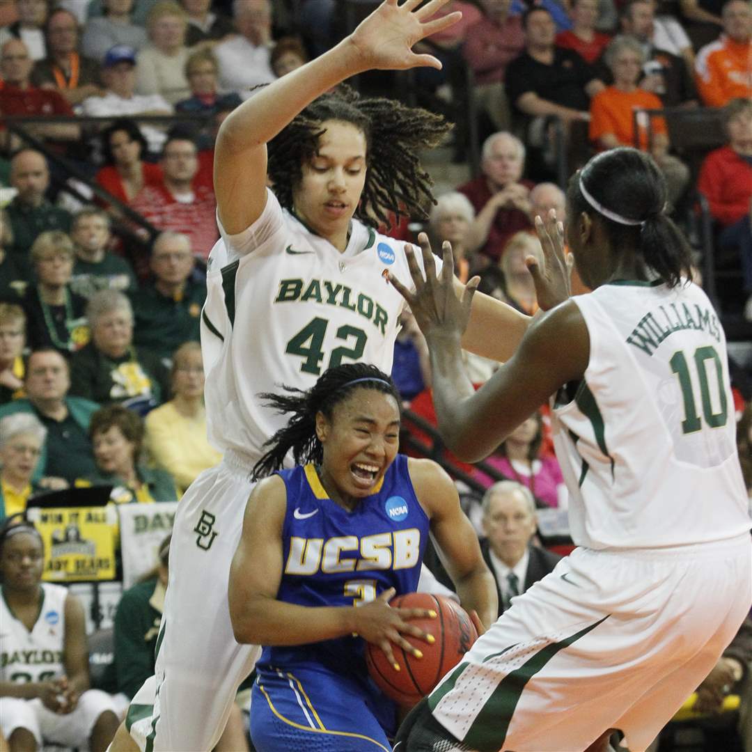 Baylor's Brittney Griner (42) and Jordan Madden (3) guard UC Santa Barbara's Melissa Zornig.