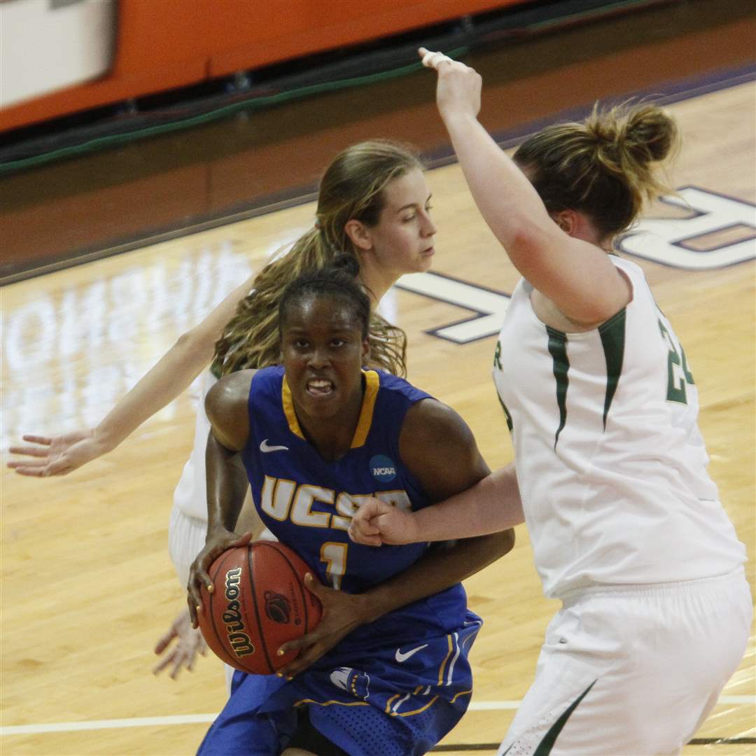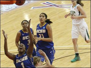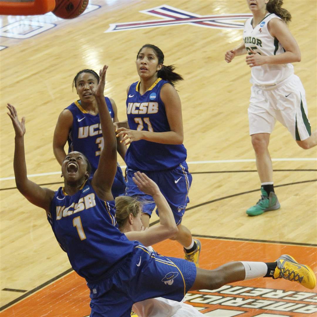 UC Santa Barbara's Sweets Underwood splits Baylor defenders Makenzie Robertson, left, and Ashley Field.