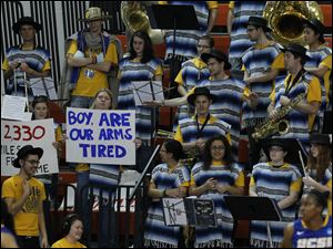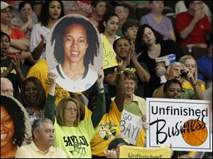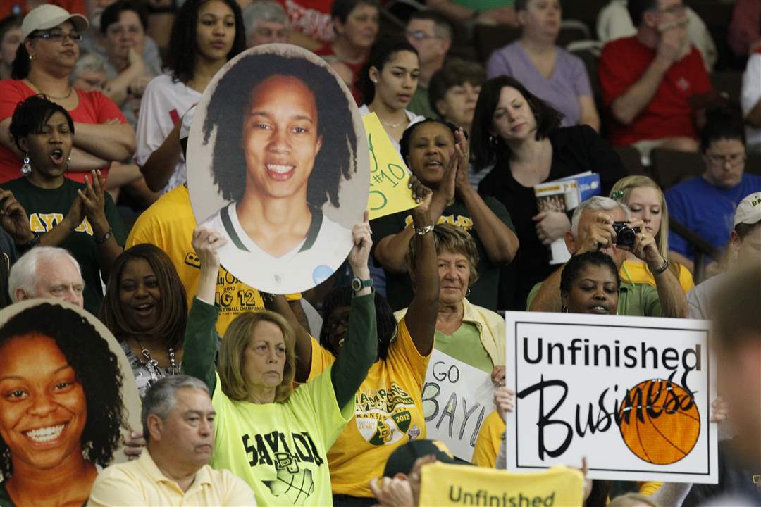 Baylor fans hold up signs of star player Brittney Griner at Bowling Green's Stroh Center.
