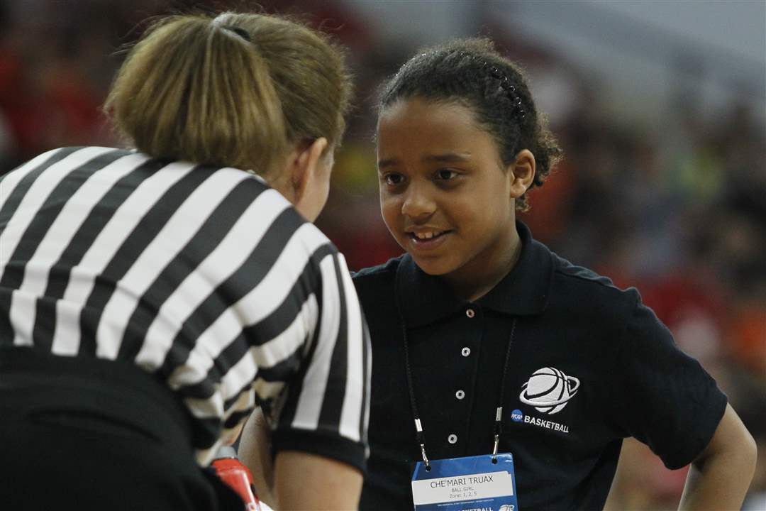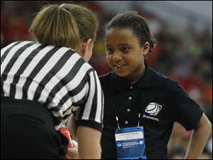 Che'Mari Truax, 10, of Perrysburg gives one of the referees water during a timeout.