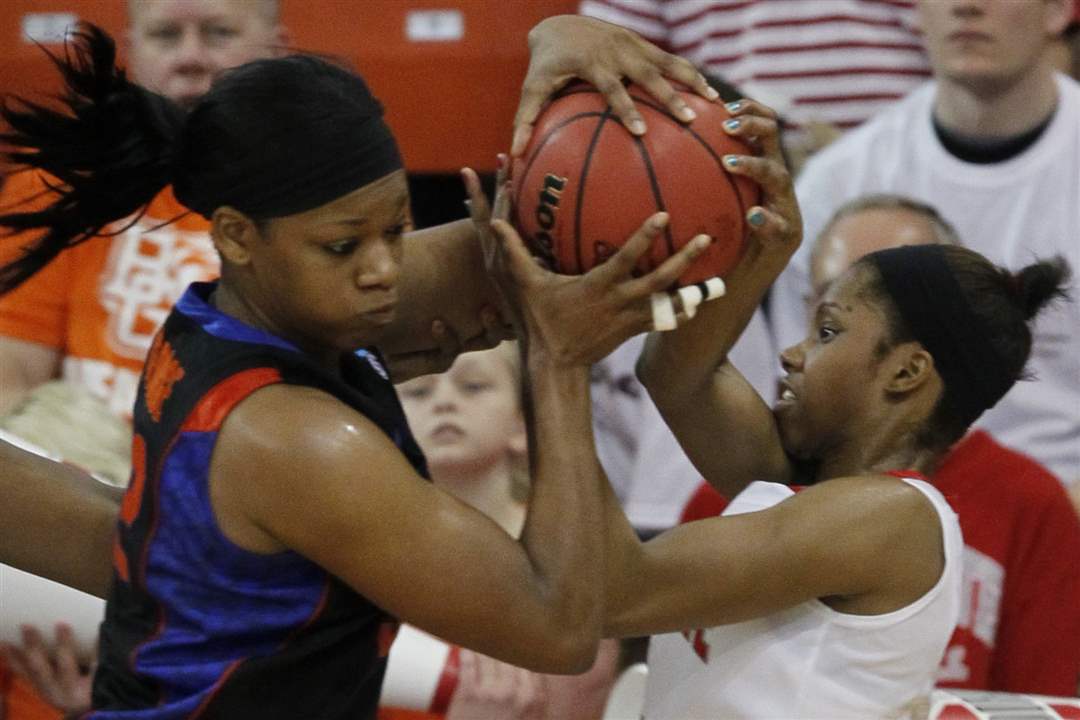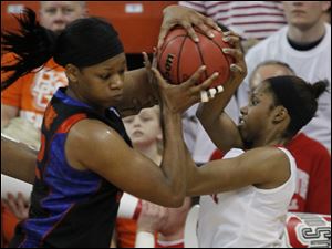 Florida's Lanita Bartley, left, and Deana Allen, tie up Ohio State's Tayler Hill.