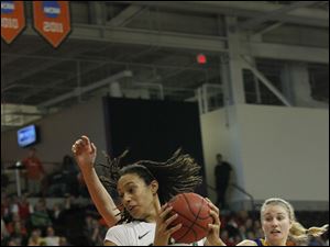 Baylor's Brittney Griner grabs the ball over UC Santa Barbara's Kirsten Tilleman.