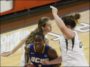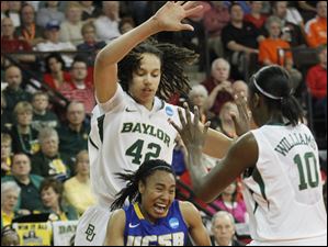 UC Santa Barbara's Nicole Nesbit is defended by Baylor's Brittney Griner, rear, and Destiny Williams.