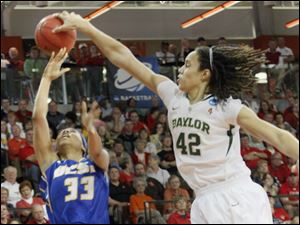 Baylor's Sune Agbuke blocks UC Santa Barbara's Destini Mason late in the game.
