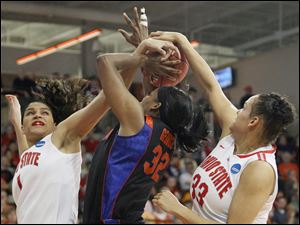 Ohio State's Kalpana Beach, and Ashley Adams (33) try to stop Florida's Jennifer George from shooting.