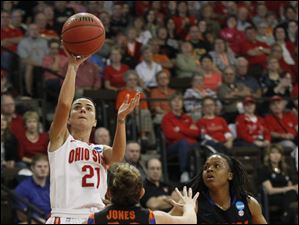 Ohio State's Samantha Prahalis shoots over Florida's Jordan Jones and Amber Stokes (3).