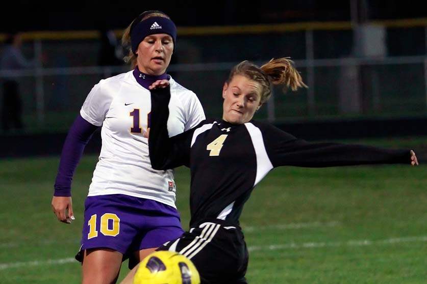 Perrysburg's Rachel Olmstead, left, collides with Maumee's Taylor Wulf.