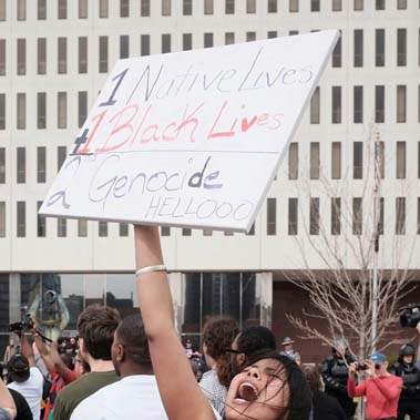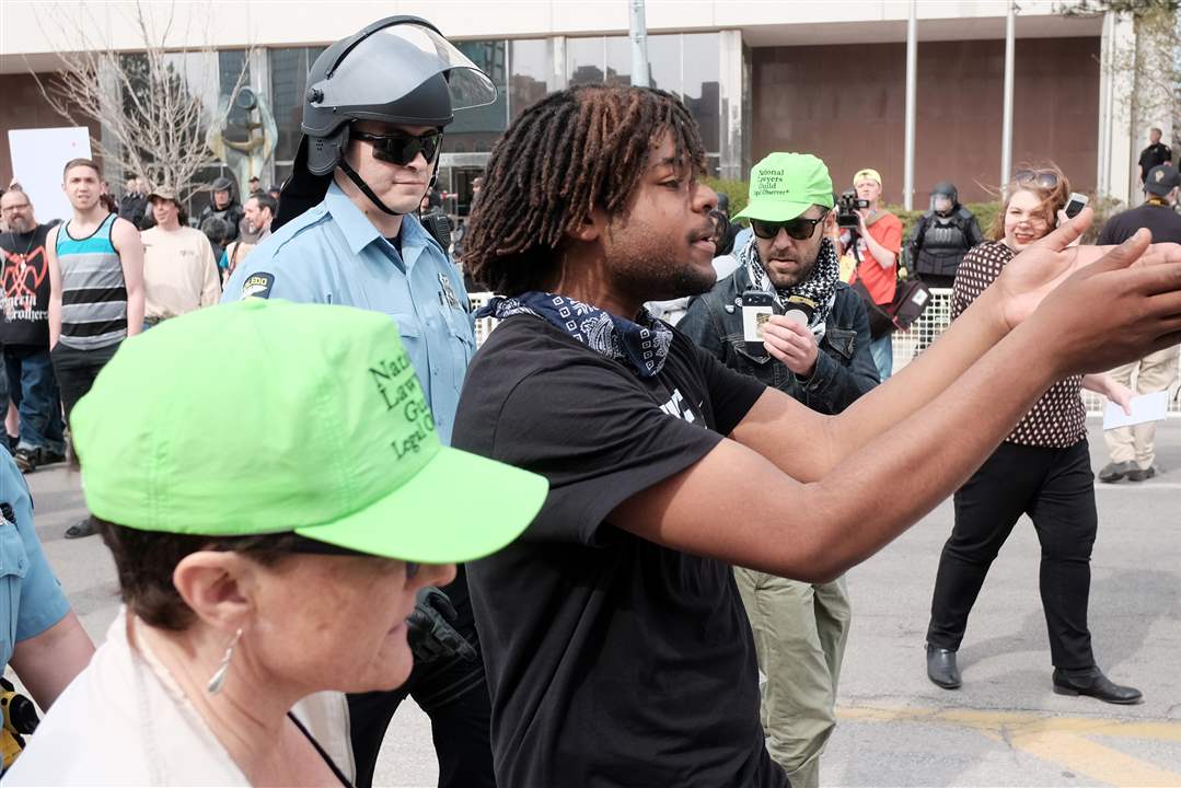 Deonte Moss of Toledo holds up a sign during The National Socialist Movement rally on the steps of One Government Center.