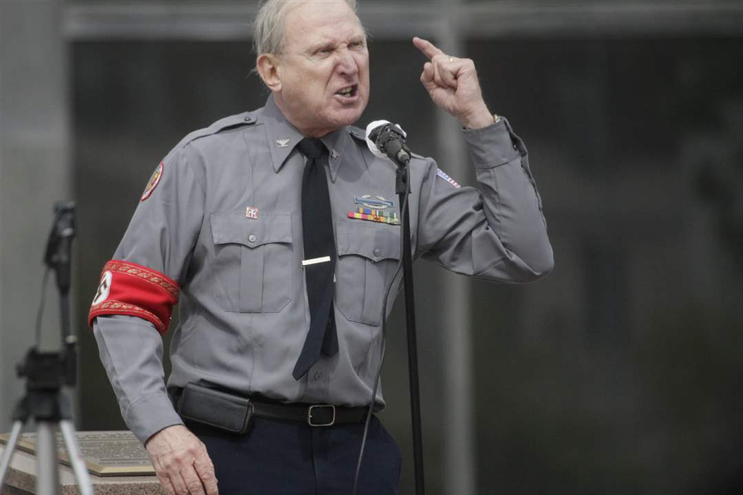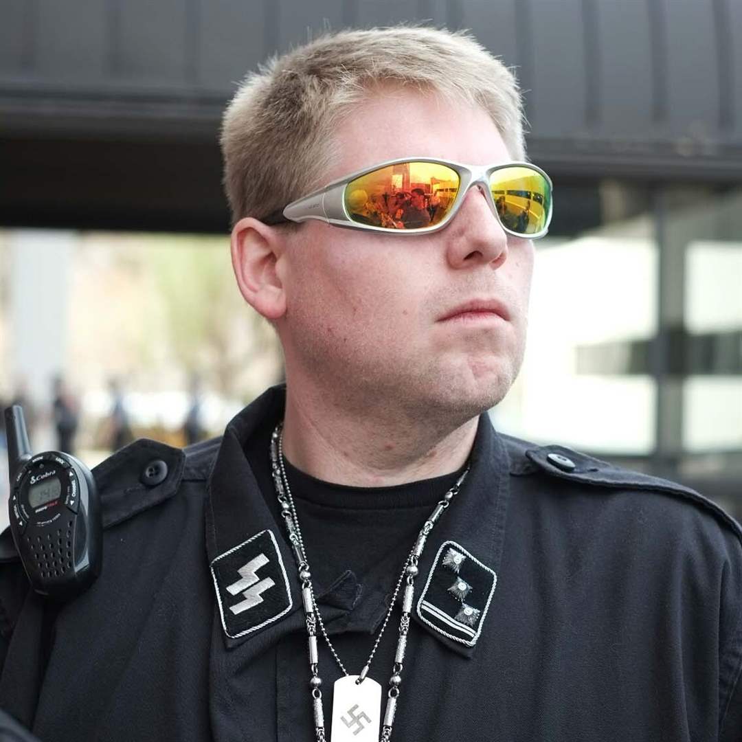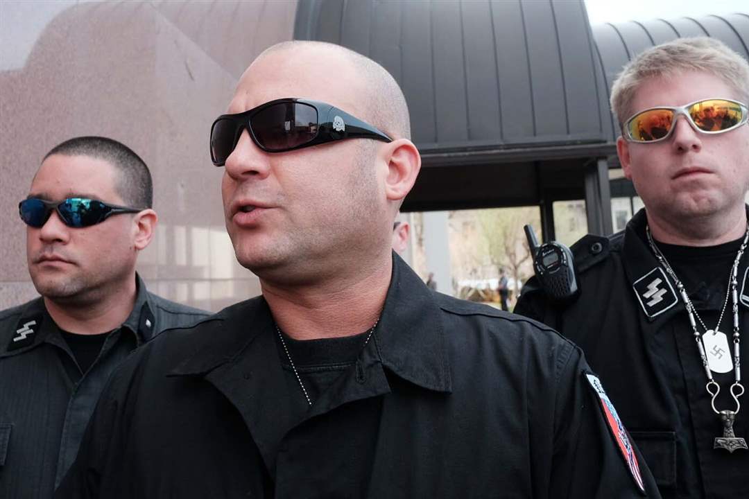 Jeff Schoep, commander of the The National Socialist Movement, speaks to the media before a rally on the steps of One Government Center.