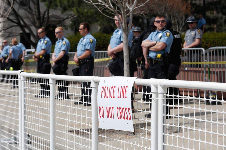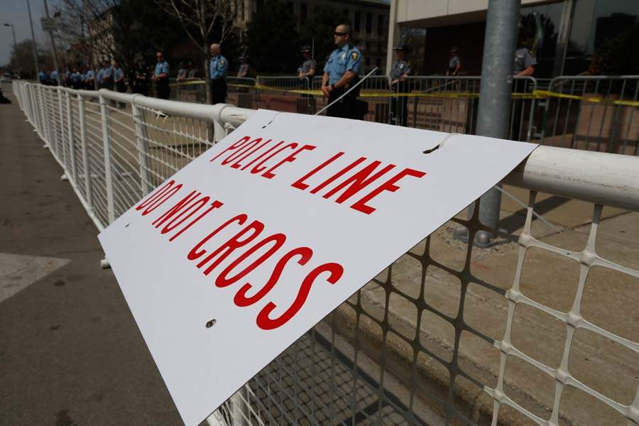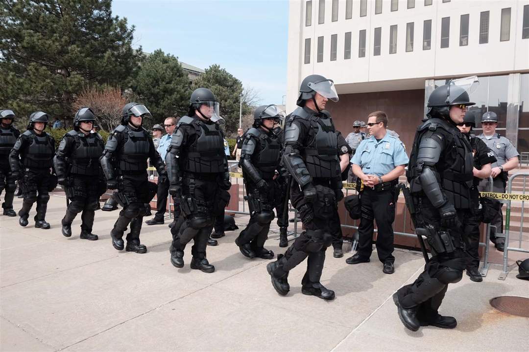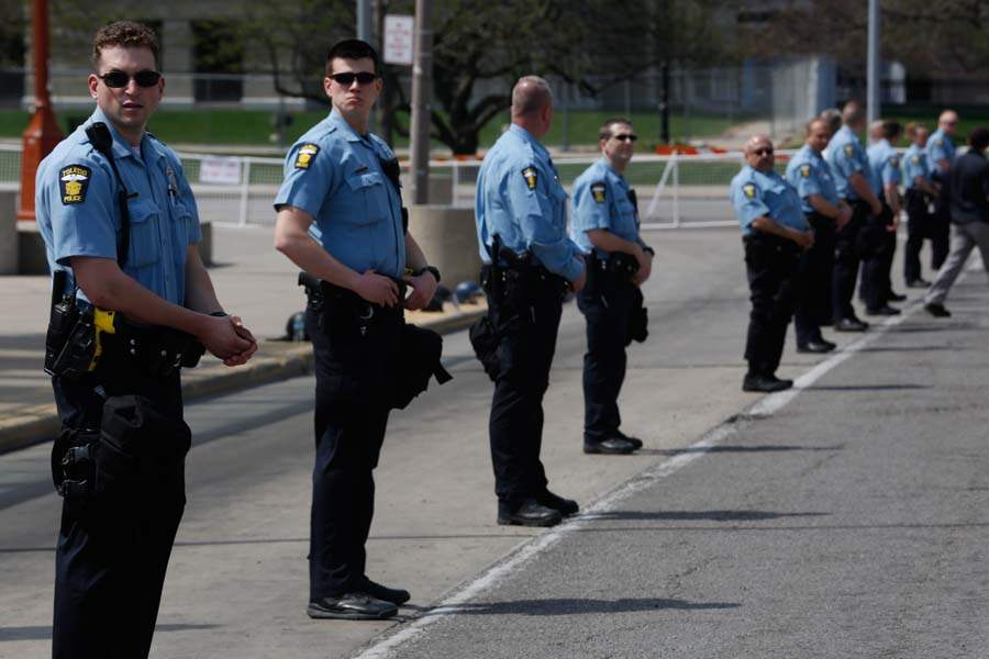 Members of the Toledo Police Department stand guard in front of One Government Center in preparation for The National Socialist Movement rally.