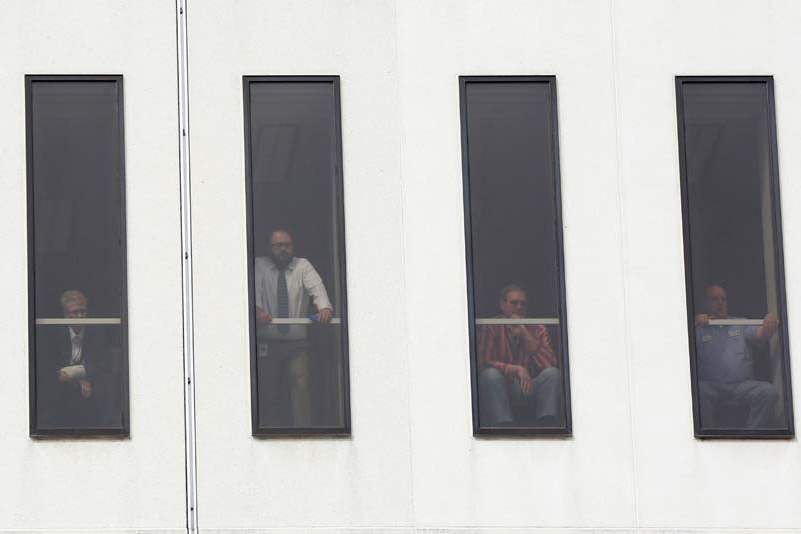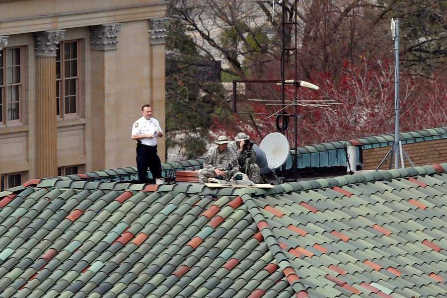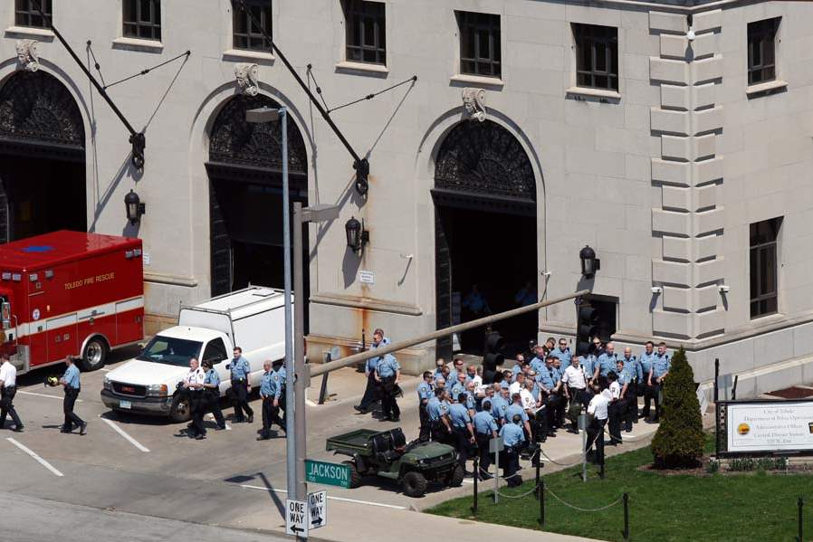 Members of the Toledo Police Department stand guard on top of the Safety Building.