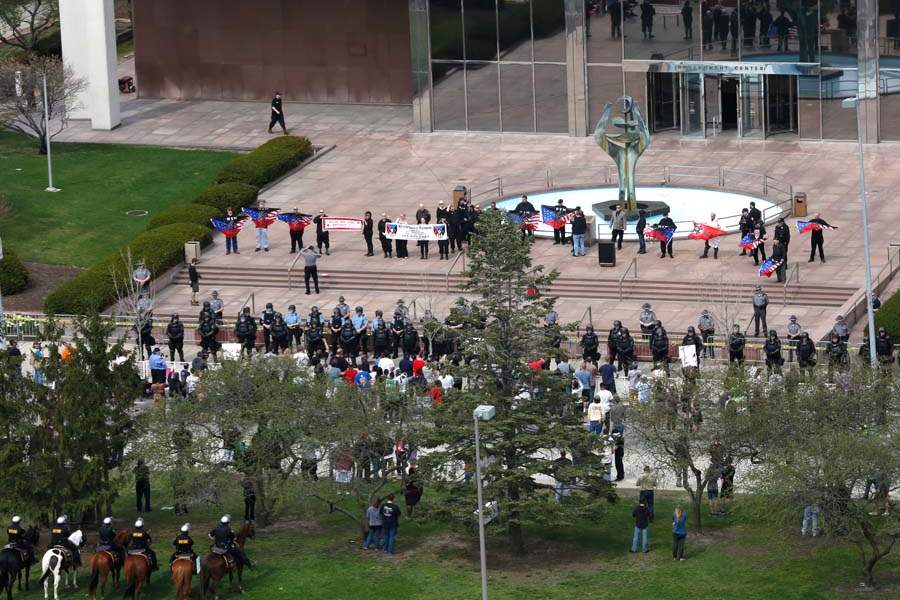 Members of the Toledo Police Department stand guard in front of One Government Center while The National Socialist Movement holds a rally.