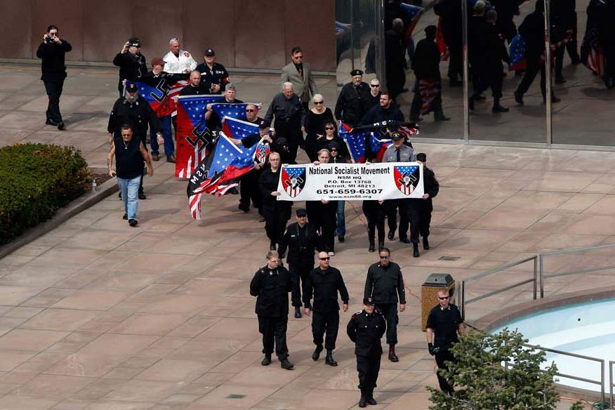 The National Socialist Movement marhes on to the grounds of One Government Center.