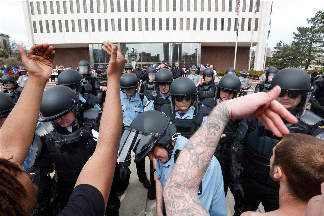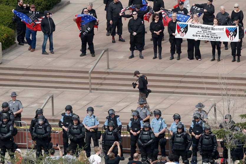 Members of the Toledo Police Department stand guard between members of the National Socialist Movement and protesters.