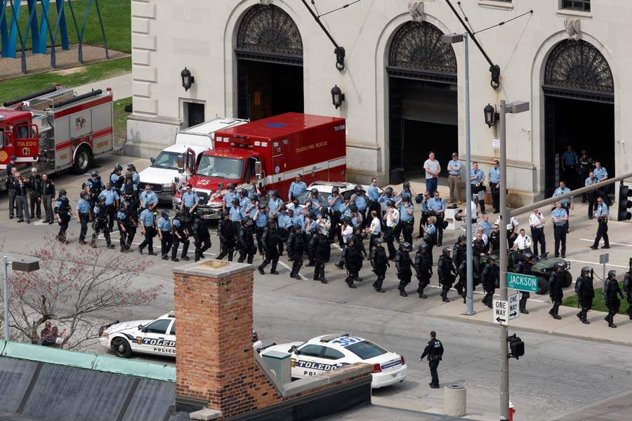 Members of the Toledo Police Department stand guard in front of One Government Center.