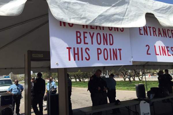 Toledo police post signs prohibiting weapons at the entrance to the National Socialist Movement rally area in downtown Toledo.