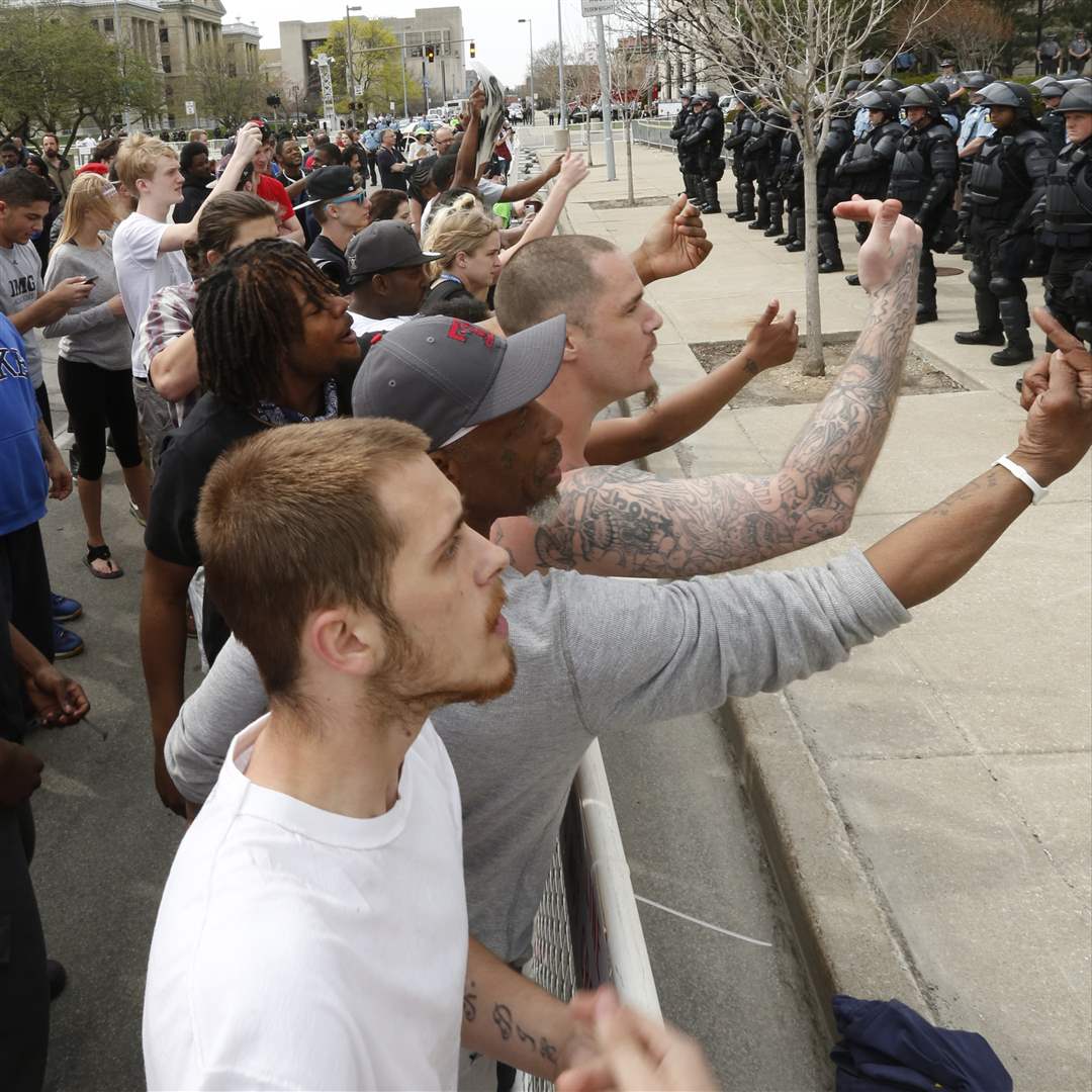 Demonstrators against the Nazis challenge them while Toledo Police officers in standard uniforms, their face shields raised, repair a break in the police line in front of One Government Center.