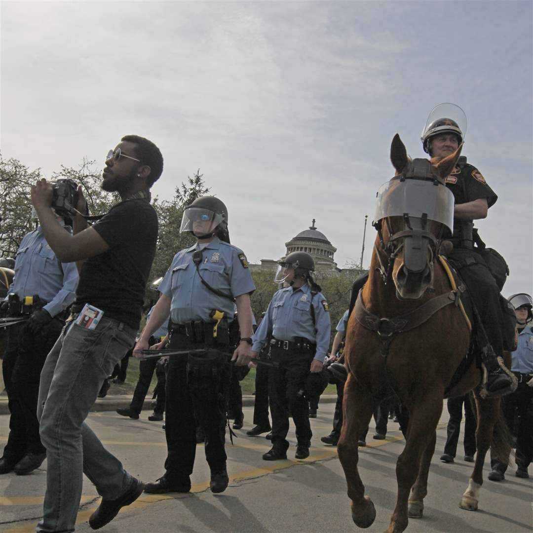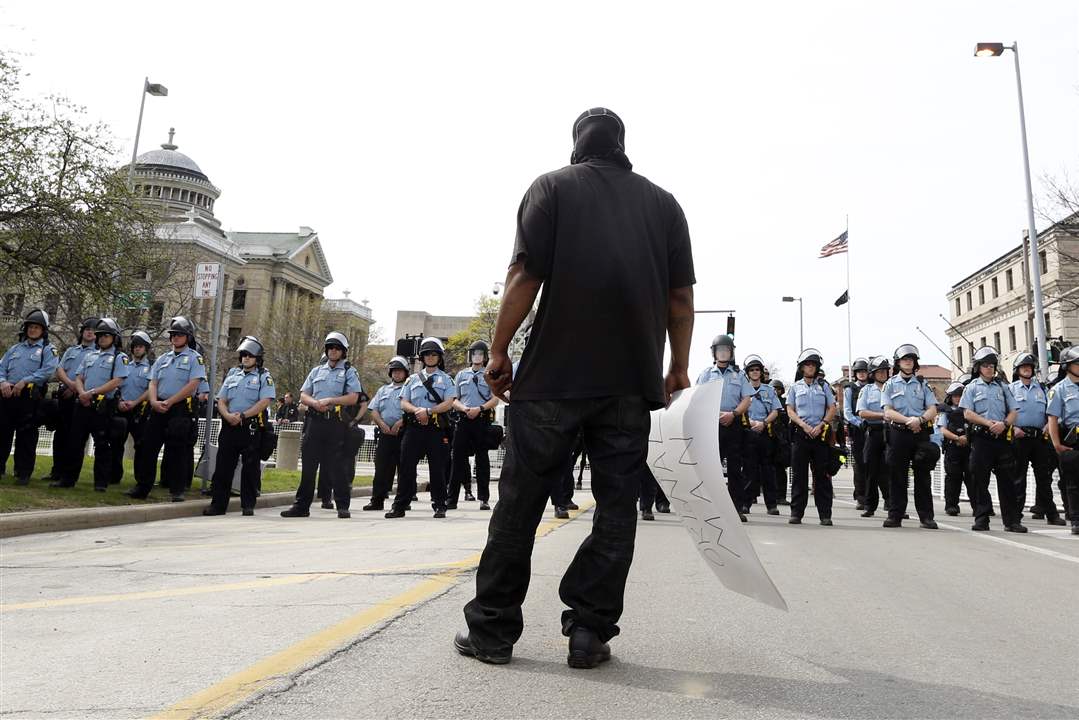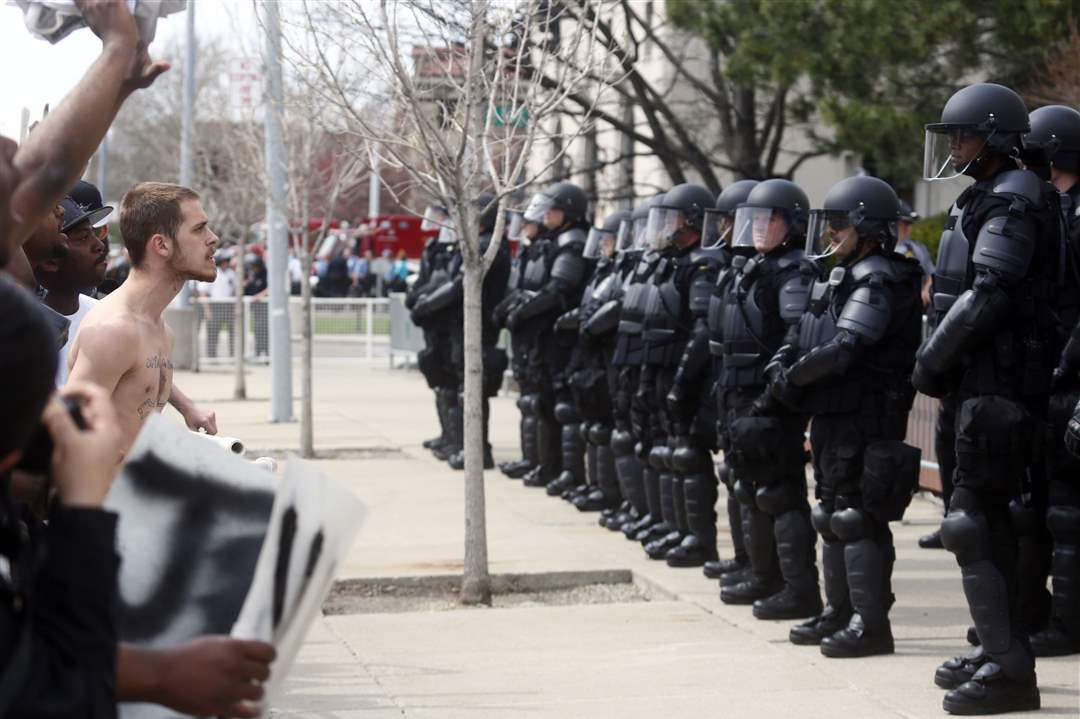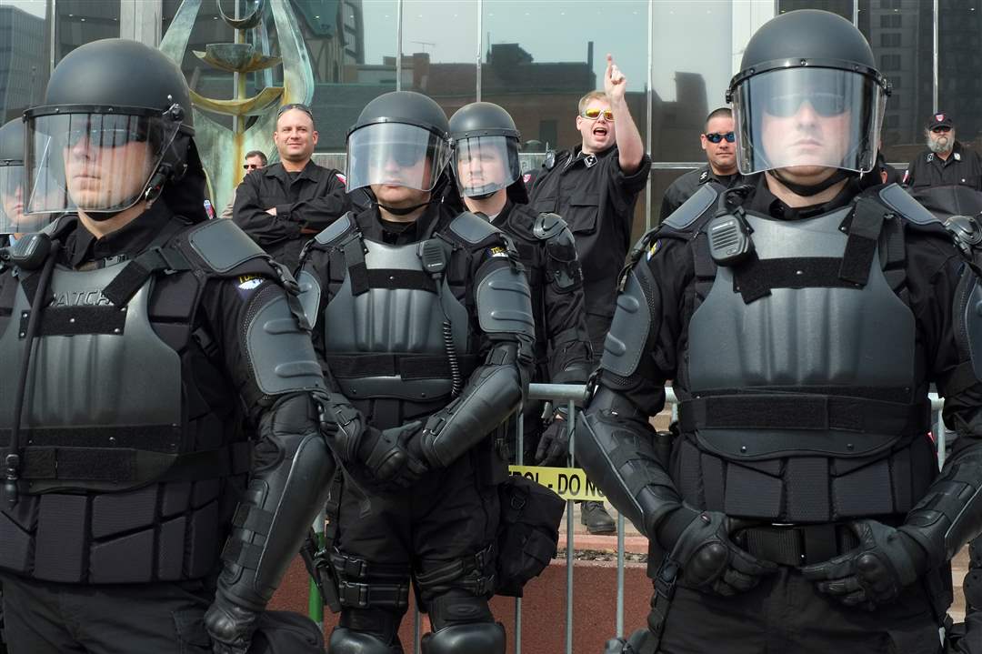 Police show up in riot gear before the National Socialist Movement holds a rally in downtown Toledo.
