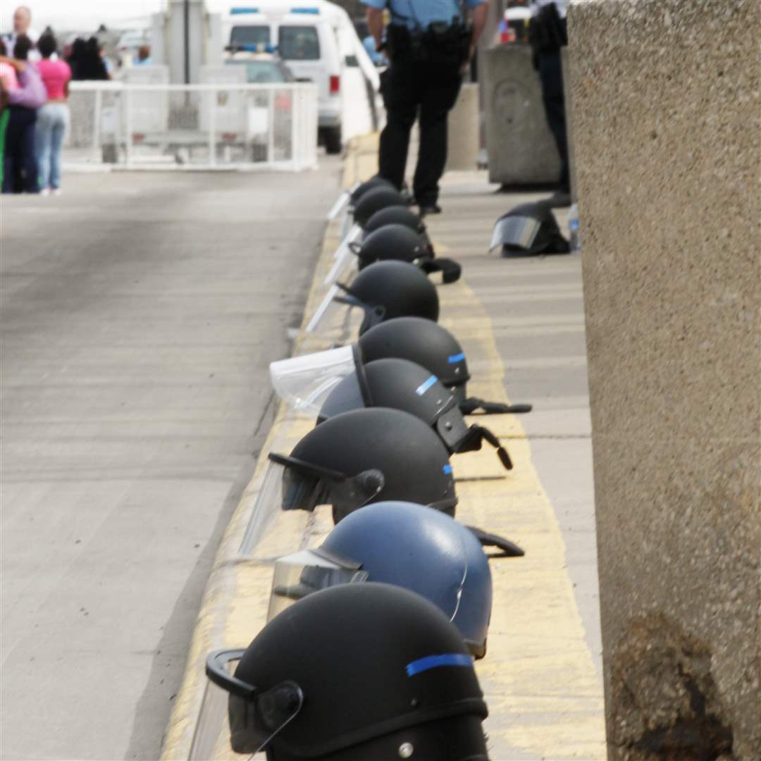 Members of the Toledo Police Department get ready in front of the Safety Building in preparation for The National Socialist Movement rally on the steps of One Government Center at 3:30 p.m.