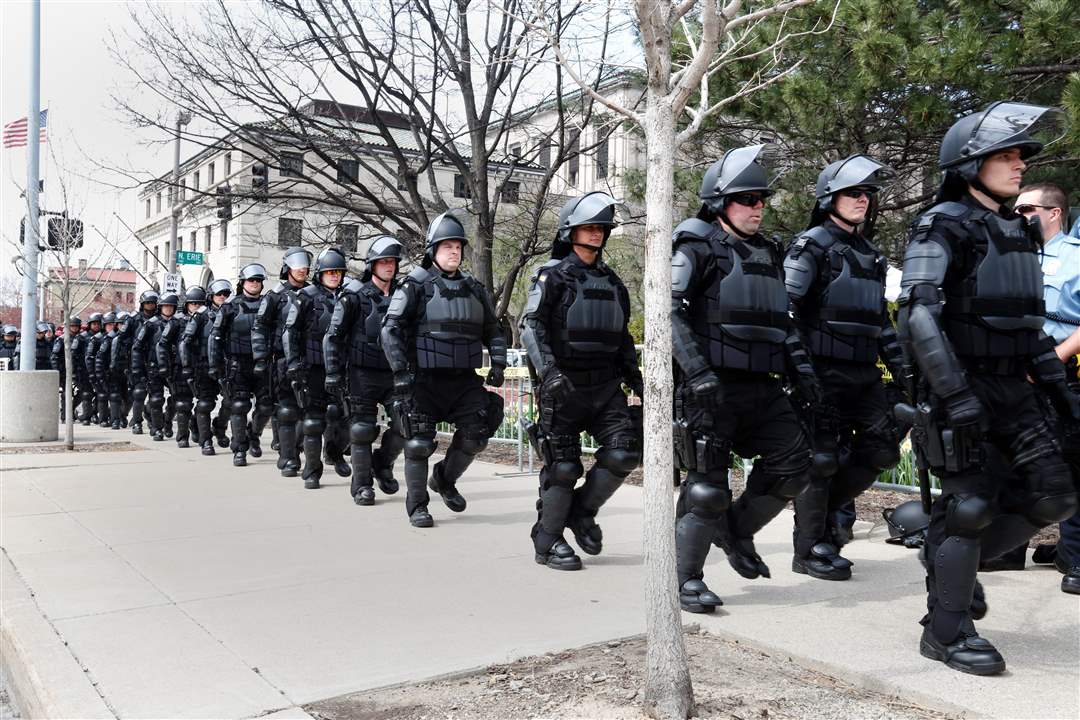 Members of the Toledo Police Department SAWT team march to stand guard in front the Safety Building.