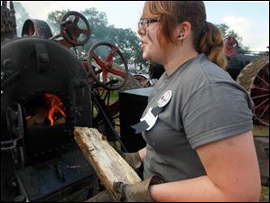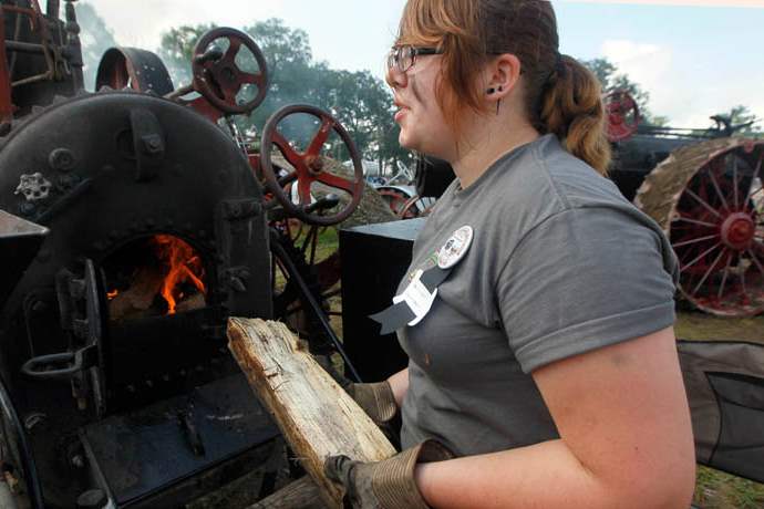 Callie Vaden, from Battlecreek, MI, puts wood into the fire of her 1895 Nichols & Shepard steam traction.
