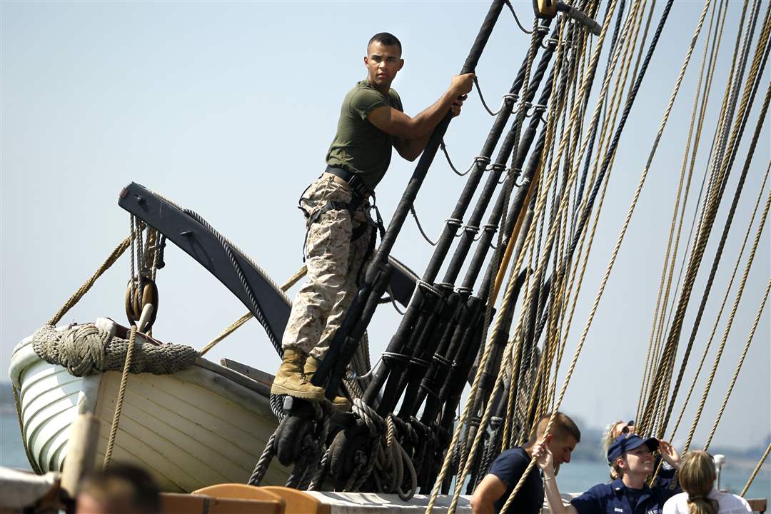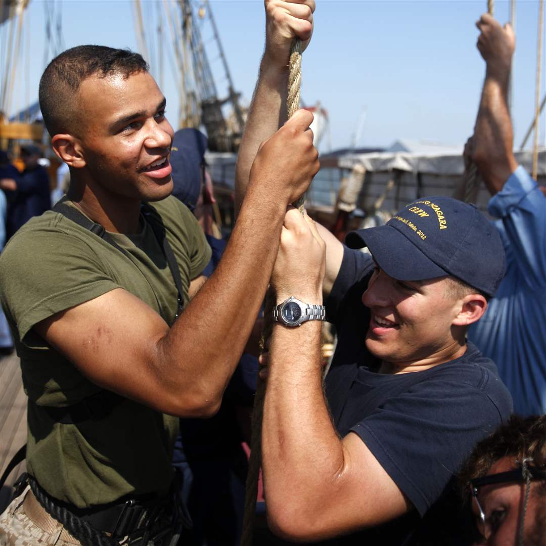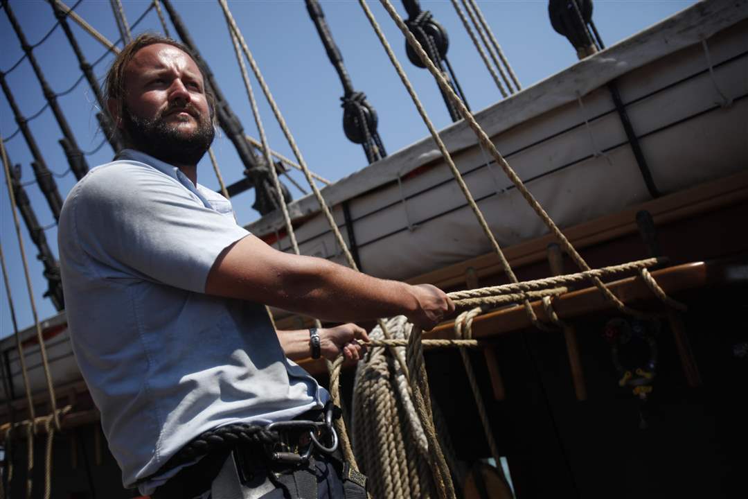 Michael Hilbert, 23, a machinery technician 3rd class for the U.S. Coast Guard, helps pull a rope controlling the direction of the sail aboard the U.S. Brig Niagara during its day-long sail on Lake Erie during Navy Week on Saturday, Aug. 25, 2012.