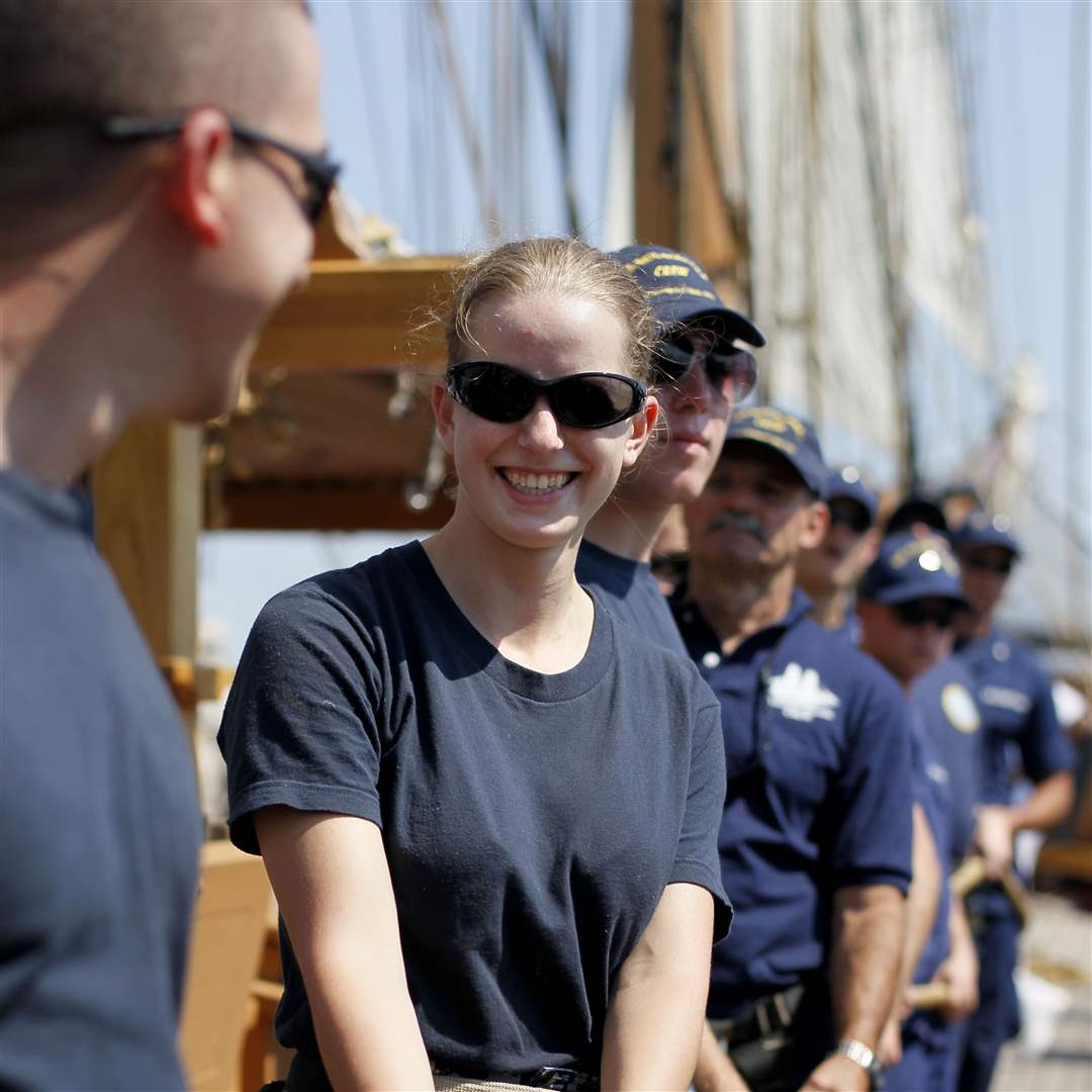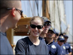 Tori Delap, 19, of the NROTC at Miami University, mingles with her fellow crewmembers while waiting for the order to redirect a sail aboard the U.S. Brig Niagara during its day sail on Lake Erie on Saturday, Aug. 25, 2012.