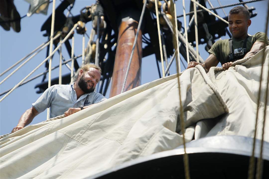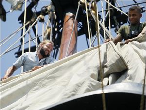 Crew members of the U.S. Brig Niagara roll up the front sail of the ship during its day-long sail on Lake Erie during Navy Week on Saturday, Aug. 25, 2012.