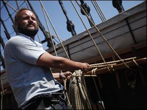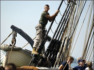 After lowering the ship's front sail, Dominic Grayk, of the NROTC at Miami University, climbs down the nets of the U.S. Brig Niagara during its day-long sail on Lake Erie on Saturday, Aug. 25, 2012.