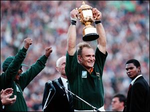 In this June 24, 1995, photo, South African rugby captain Francios Pienaar, center, raises the trophy after receiving it from South African President Nelson Mandela, left, who wears a South African rugby shirt, after they defeated New Zealand in the final 15-12 at Ellis Park, Johannesburg. Mandela strode onto the field wearing South African colors and bringing the overwhelmingly white crowd of more than 60,000 to its feet. They chanted "Nelson! Nelson! Nelson!" as Mandela congratulated the victorious home team in a moment that symbolized racial reconciliation.