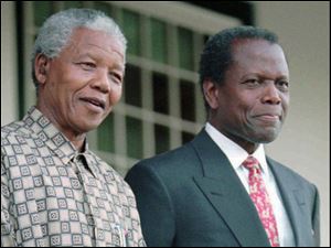In this May 17, 1996 photo, South African President Nelson Mandela, left, and actor Sidney Poitier appear at a news conference in Cape Town. Poitier is in South Africa making a film in which he portrays Mandela, alongside Michael Caine, who plays former President F. W. de Klerk in "Mandela and de Klerk," about the country's transition from a white minority government to black majority rule.