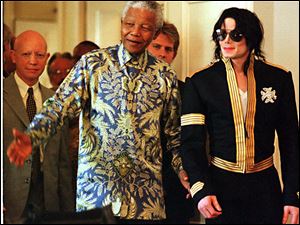 In this March 23, 1999 photo, South African President Nelson Mandela, left, stands with American pop singer Michael Jackson at a news conference in Cape Town where Jackson announced dates for two concerts in June of which profits will go to various funds including the Nelson Mandela Children's Fund.