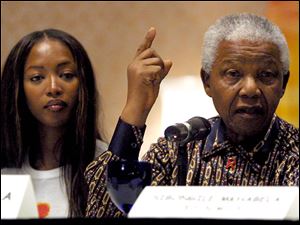 In this July 30, 2001 photo, former President of South Africa, Nelson Mandela, right, speaks during a press conference alongside British model Naomi Campbell in Barcelona, Spain, before the 'Frock and Roll' benefit concert to raise money for the Nelson Mandela Children's Fund.