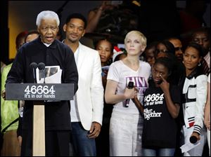 This June 27, 2008 photo shows Nelson Mandela, left, speaking as Will Smith, second from left, Annie Lennox, center, and Jada Pinket Smith, right, look on at the 46664 charity concert in honor of Mandela's upcoming 90th birthday in London.