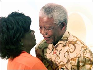 In this Dec. 6, 2002 photo, former South African President Nelson Mandela, right, and American talk show host Oprah Winfrey embrace.