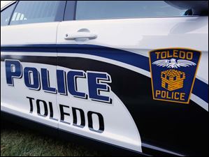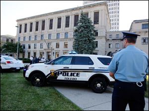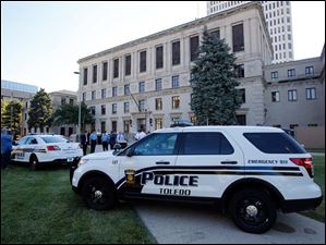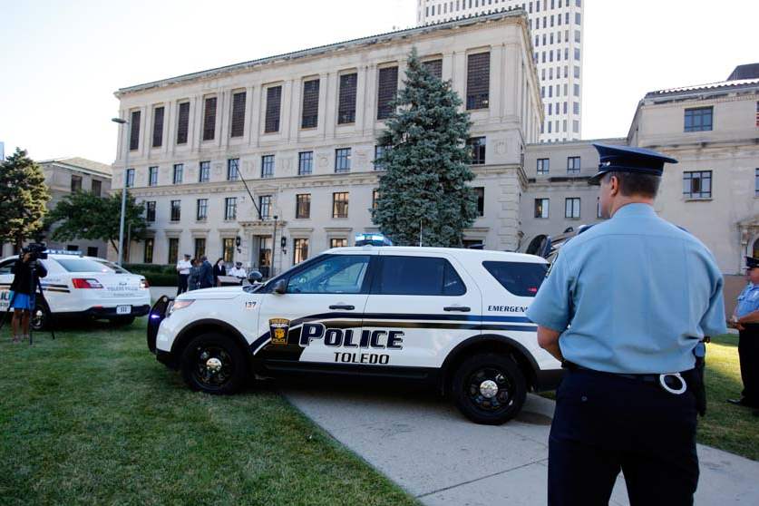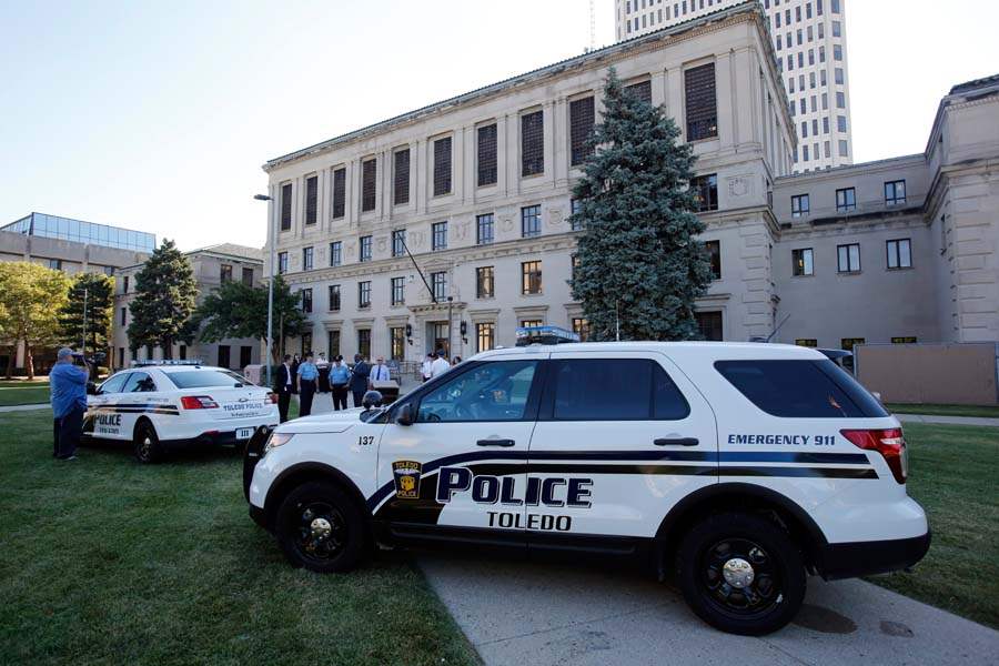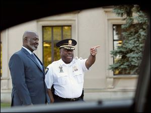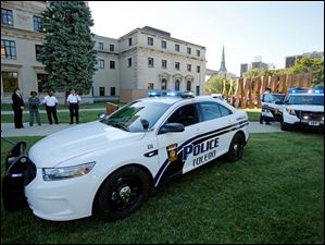 Toledo Mayor Mike Bell and Police Chief Derrick Diggs view three of the police department's new vehicles during a news conference outside the Safety Building.