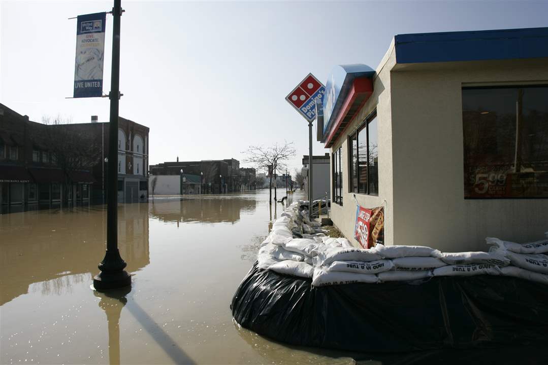 Sandbags prevent flood water from the Blanchard River from entering a Domino's Pizza on North Main Street in Findlay, Ohio, Tuesday, March 1, 2011.