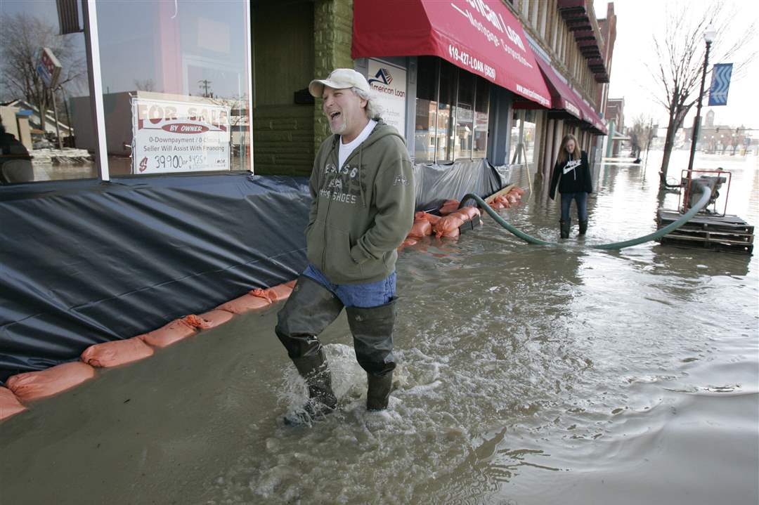 Brad Hendricks and his step daughter Ashley Hicks walk through flood water on North Main Street in Findlay, Ohio, Tuesday, March 1, 2011. Ashley and her mother, Teresa Hendricks, not pictured, opened a secondhand clothing store on the street a month ago. They removed their merchandise on Monday before the street flooded.