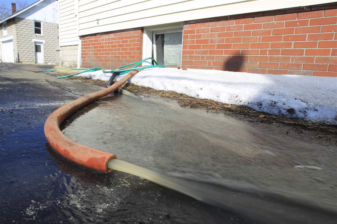 Water is pumped from a flooded basement on North Main Street in Findlay, Ohio, Tuesday, March 1, 2011.